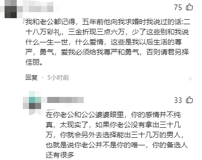 我和老公都记得,五年前他向我求婚时我说过的话:二十八万彩礼,三金折现三点六万,少了这些别和我说什么一生一世,什么爱情,这些是我以后生活的尊严,勇气,爱我必须给我尊严和勇气,否则请君另择佳丽。