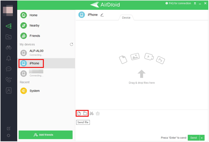 在电脑上的 AirDroid 界面中,选择“我的设备”下的 iPhone。然后将文件拖放到界面中。或者点击“文件”或“文件夹”图标,从电脑中选择文件。发送文件。