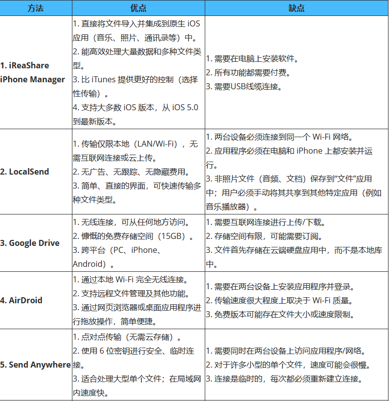 结论如果您更喜欢像iReaShare iPhone Manager这样功能强大的专业应用程序,您可以下载它,然后轻松地在电脑和 iPhone 之间传输文件。这款工具将为您提供更多实用功能。如果您喜欢 Google Drive 和 iCloud 等云服务的便捷性,可以直接使用它们在设备之间同步文件。当然,您也可以选择其他无需 iTunes 的文件传输方式。
