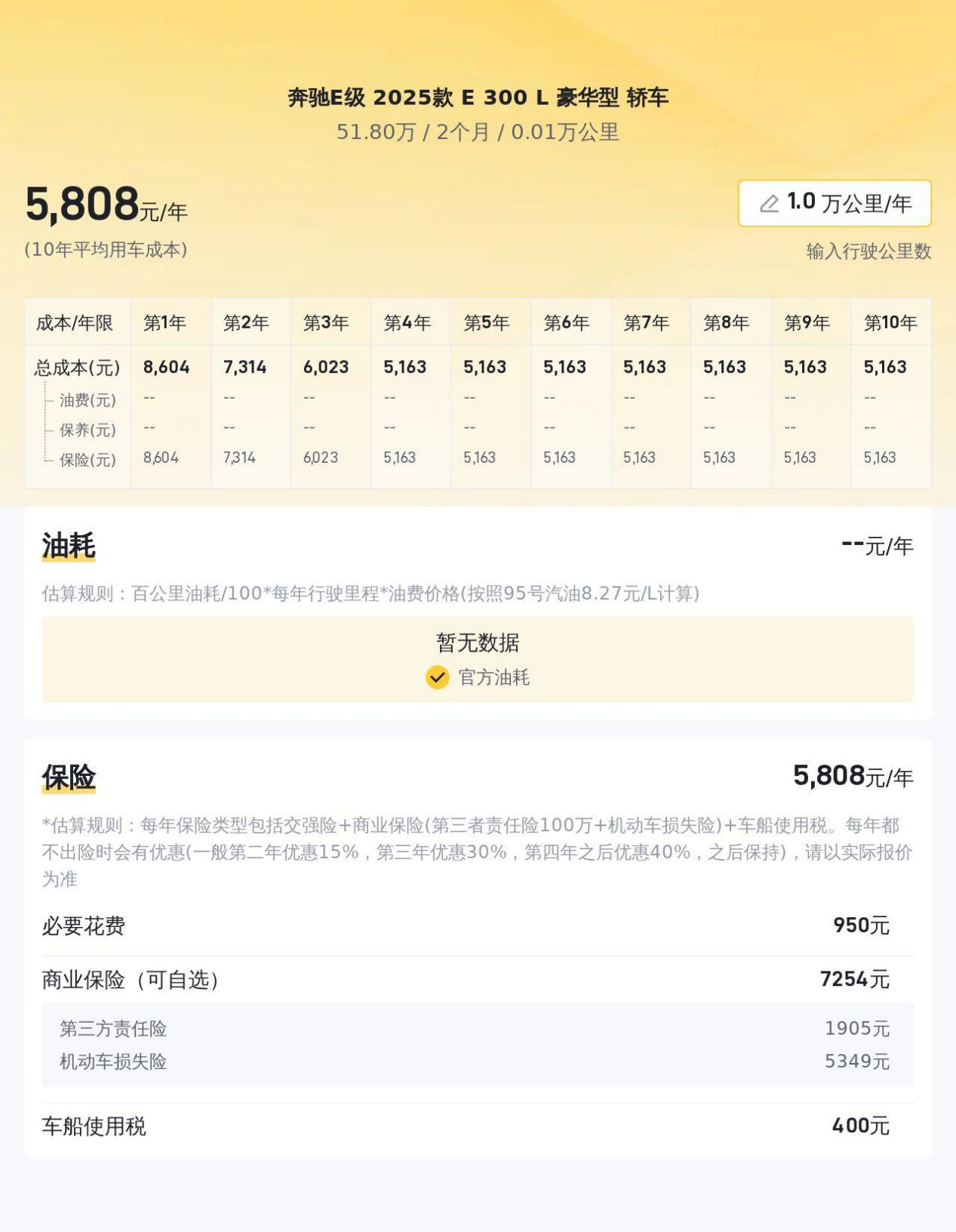 养车成本也是一个需要考虑的因素。根据估算,E300L一年的保险费用约为6302元,保养费用约为3180元,油费约为11308元,总计约为20790元。这个数字在同级别车型中属于中等偏下水平,相对比较经济。