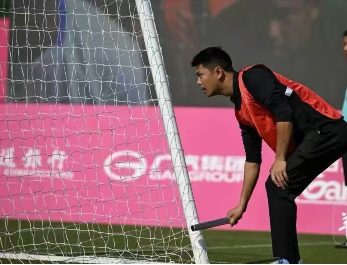 在盲人足球比赛中,还有一个特殊的岗位——引导员,由健全人士担任。比赛中,他们相当于球员的“眼睛”,会站在球门后方,不停地呼喊,告诉球员相应信息,尤其在点球或者任意球时,他们会拿一个铁棍敲击球门左、右、中间,帮助球员辨别方向。