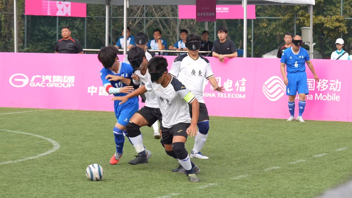 盲人足球的运动员上场前,必须佩戴特制的眼罩,确保运动员无论视力残疾程度如何,都要在绝对黑暗中公平竞技,运动员奔跑、传球、射门等每个动作都只能依靠声音来进行判断,让听觉成为赛场核心能力,“可以说,盲人足球就是用‘耳朵’踢。”杨大勇说。