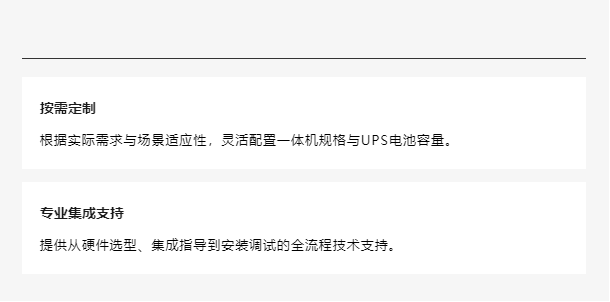 拓扑说明:UPS模块作为系统的“电力缓冲池”,持续净化市电,并在任何断电瞬间立即无缝接管供电。一体机在此受保护的电力环境下持续运行,直至收到UPS的智能信号,有序执行数据保存与安全关机,全过程自动完成,无感适应现场断电。