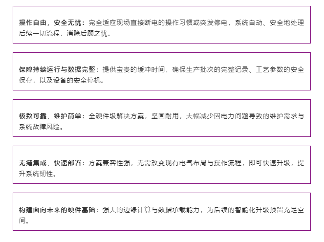 本方案通过高性能工业一体机与专用工业UPS模块的深度硬件集成,打造了一套能够从容适应现场各种断电情况的坚固系统。它确保即使在突然断电时,设备与数据也能获得充足的时间完成安全流程,让客户专注于生产本身,无需为电力担忧。