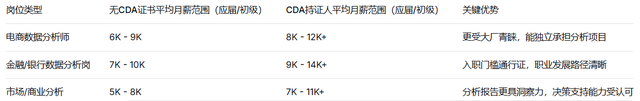 根据业内薪酬调研数据显示,CDA持证人的平均起薪和薪资涨幅均显著高于同岗位无证书者。 以下是一个简单的对比示意: