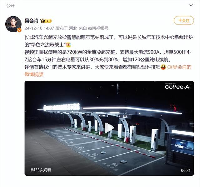 长城汽车CTO吴会肖于12月11日宣布,长城汽车光储充放检智慧能源示范站已建成,标志着公司在绿色能源发展上迈出重要一步。