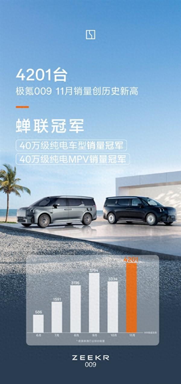 极氪智能科技副总裁林金文今日宣布,旗下MPV车型极氪009在十一月销量达到4201台,再创历史新高,蝉联40万级纯电车型与40万级纯电MPV车型销量冠军。