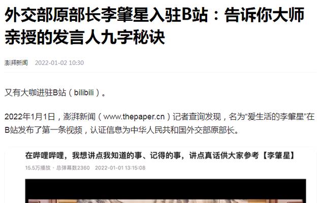 《外交部原部长李肇星入驻B站:告诉你大师亲授的发言人九字秘诀》;澎湃新闻;2022-01-02