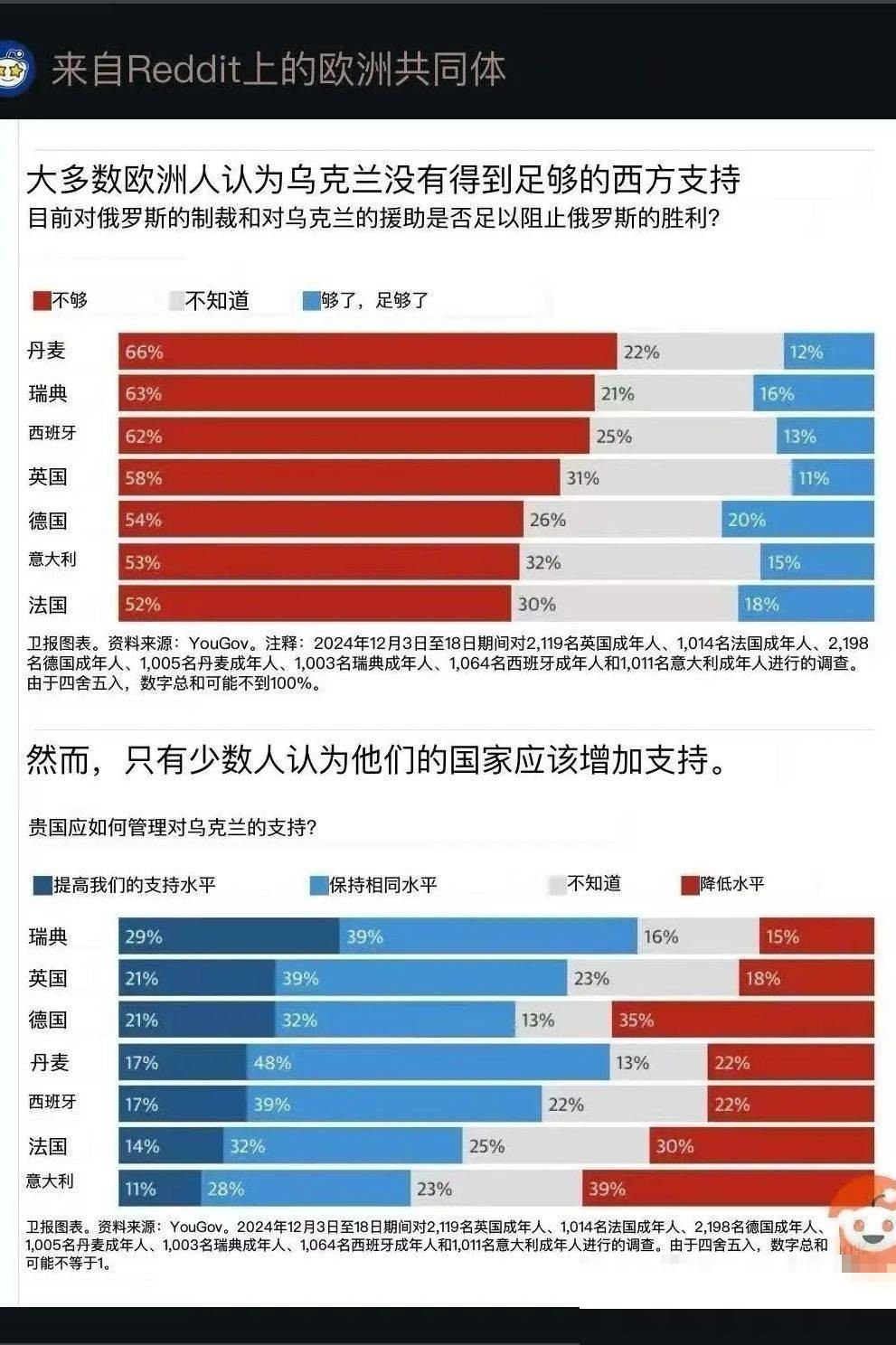 然而真金白银落地后,欧洲民众情绪急转直下。今年欧洲政策研究中心调查显示,虽然70%的受访者认为乌克兰援助不足,但其中仅30%愿意政府增加支出。德国网友甚至在3月时在X平台质疑,为什么要德国纳税人继续为乌克兰买单,毕竟本国经济已经十分疲弱。