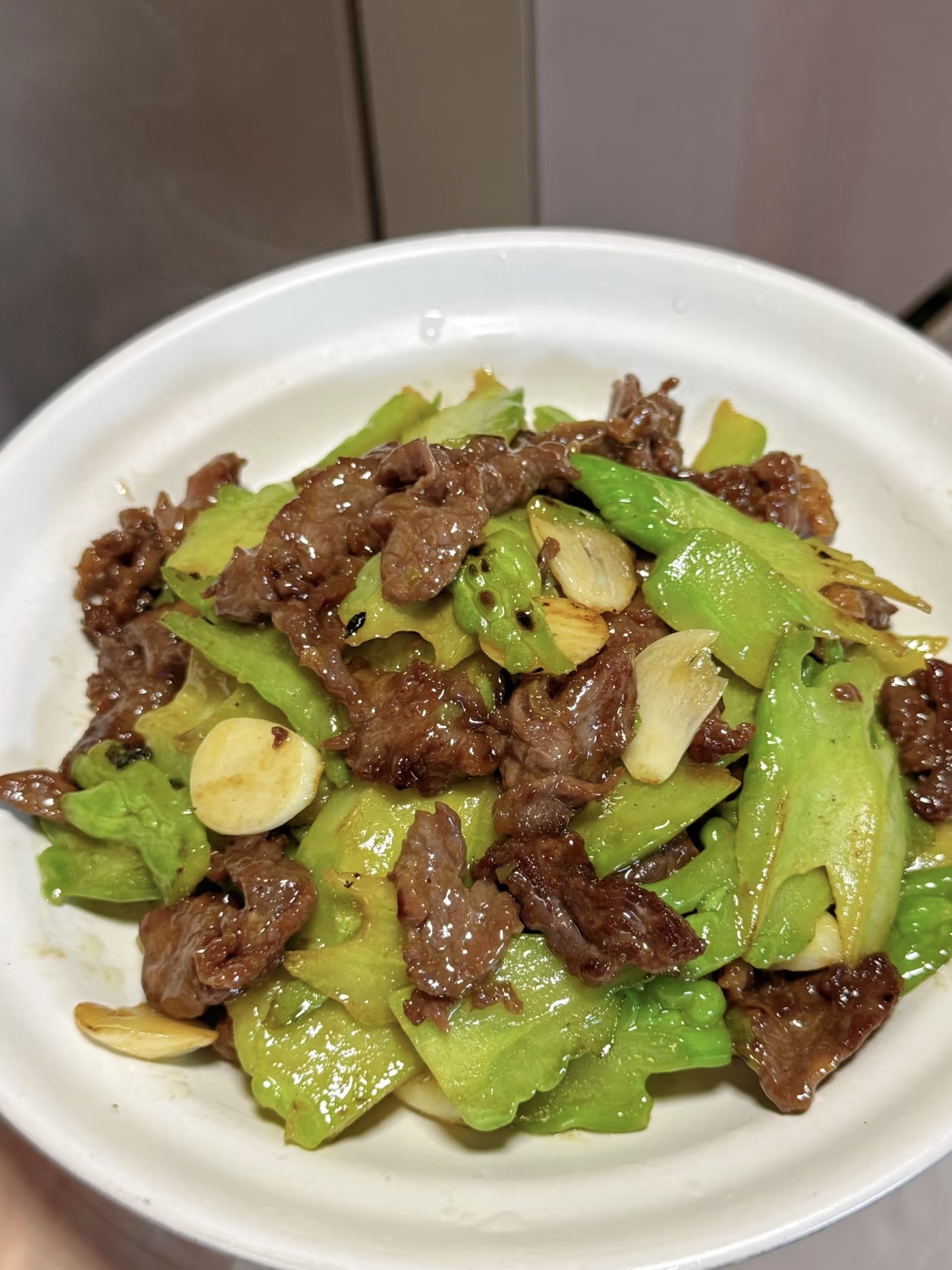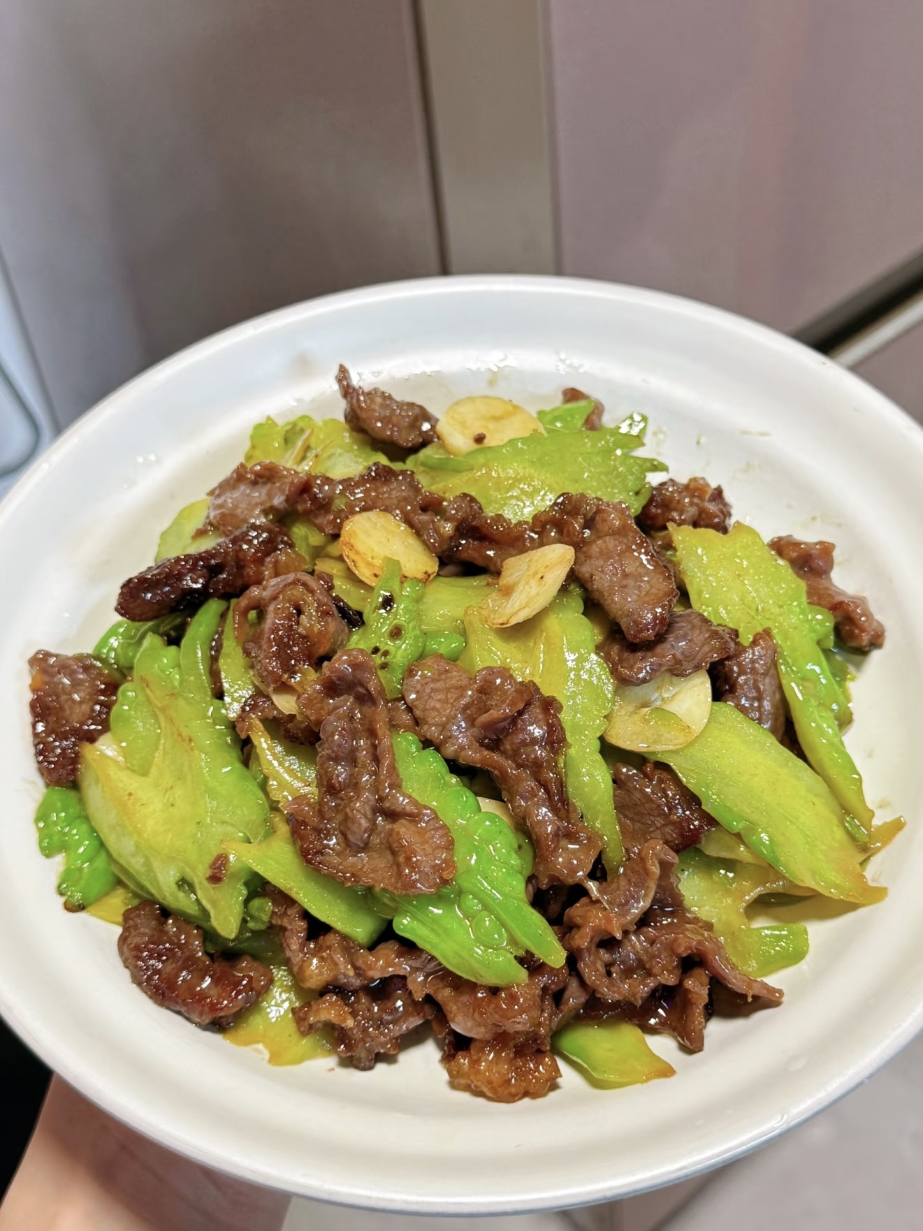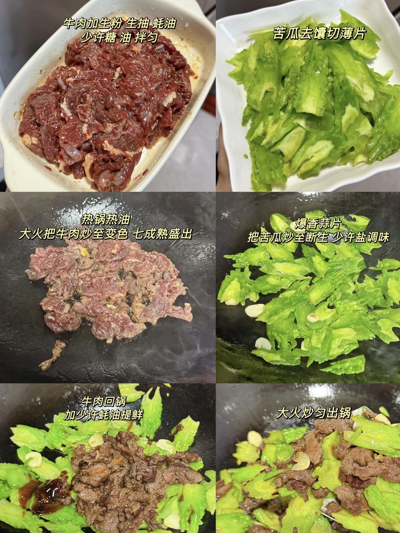 锅烧热到冒“太阳纹”,倒两勺油,油花微颤立刻下牛肉,大火快速划散,颜色一变粉立刻盛出,动作慢一秒,肉就“老给你看”。锅里补少许油,爆香姜蒜小米辣,十秒出香味后倒入苦瓜,大火翻炒四十秒,颜色从翠绿转成“油光绿”,说明它已“穿油衣”,苦味被热油温柔包裹。此时把牛肉回锅,沿锅边淋入“闪电汁”,继续大火翻炒二十秒,汁水被高温瞬间收紧,像给菜穿件亮晶晶外套。关火,撒点现磨黑胡椒,再淋两滴香油增香,翻匀起锅。