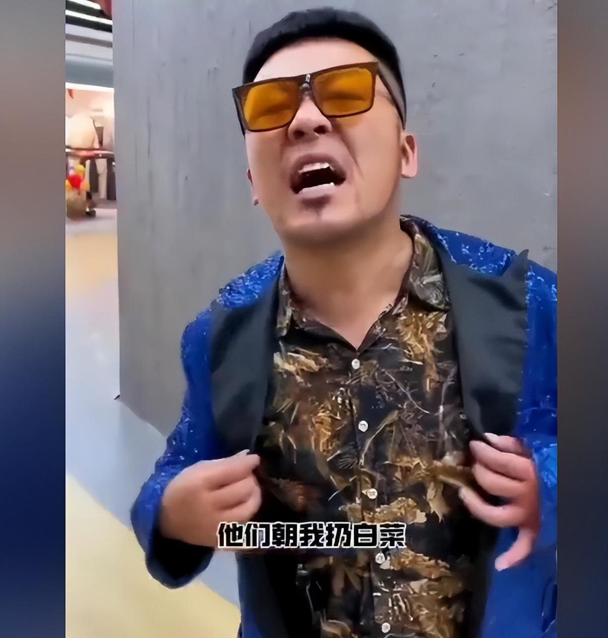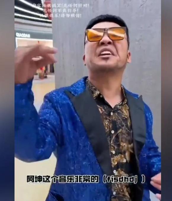 视频中个体身着一件花色衬衫,外罩蓝色西装,其着装风格确与杨坤相仿,此时另一男性个体对其发问道:“若他们向你投掷臭鸡蛋,你将如何应对?”该男子模仿杨坤时,伸出一手,以两指捏合模拟其标志性手势,随后压低嗓音陈述:“他们朝我掷白菜,我便将其烹为菜肴。”其行为表现明显,系对杨坤的模仿。