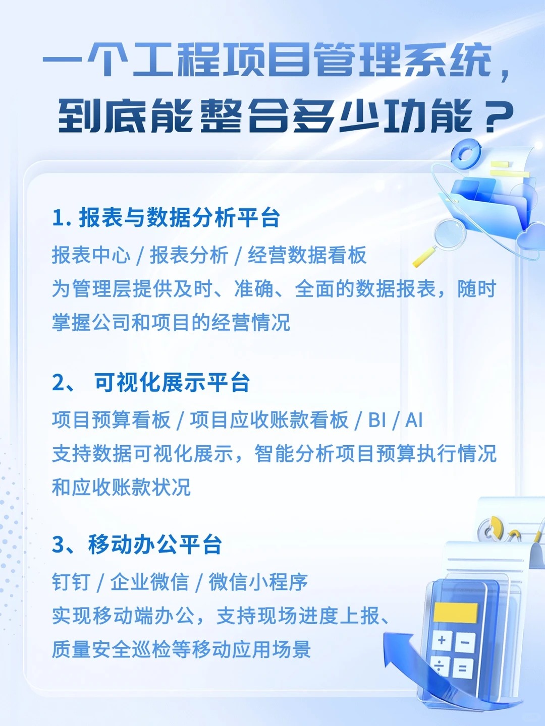 总说工程项目管理复杂,需要一堆软件来配合。 但自从我们用了这套系统,才发现原来一个平台就能搞定所有! - 👉 1. 报表与数据分析平台 不用再等月底出报表了 经营数据实时看板 老板决策不再靠“拍脑袋” - 👉 2. 可视化展示平台 项目预算执行情况一目了然 应收账款状况智能分析 数据驱动,管理更精准 - 👉 3. 移动办公平台 钉钉/企业微信都能用 现场进度随时上报 质量安全手机巡检 真正实现移动办公 - 👉 4. 全生命周期管理 从投标到结算 合同管理到成本管控 一个平台走完全流程 - 👉 5. 现场智能管控 施工进度实时跟踪 质量安全闭环管理 签证变更在线审批 - 👉 6. 财务一体化管理 发票自动关联合同 资金记账智能统计 报销流程在线完成 - 👉 7. 组织权限管理 按角色配置权限 业务流程自定义 过程执行全程监控 - 效率提升的不是一点点 如果你也在找工程管理解决方案 这套系统真的值得考虑