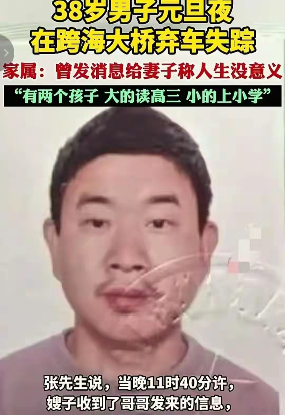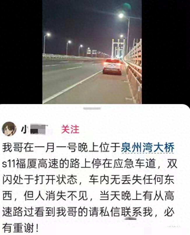 1月4日,福建一位网友发布消息,说是自己的哥哥在1月1日元旦这天晚上,在泉州湾大桥上失踪了,车子打着双闪停在桥面上,手机什么的还在车里,东西都没少,但是人却怎么找不到,联系不上,希望有看到的好心人提供帮助。
