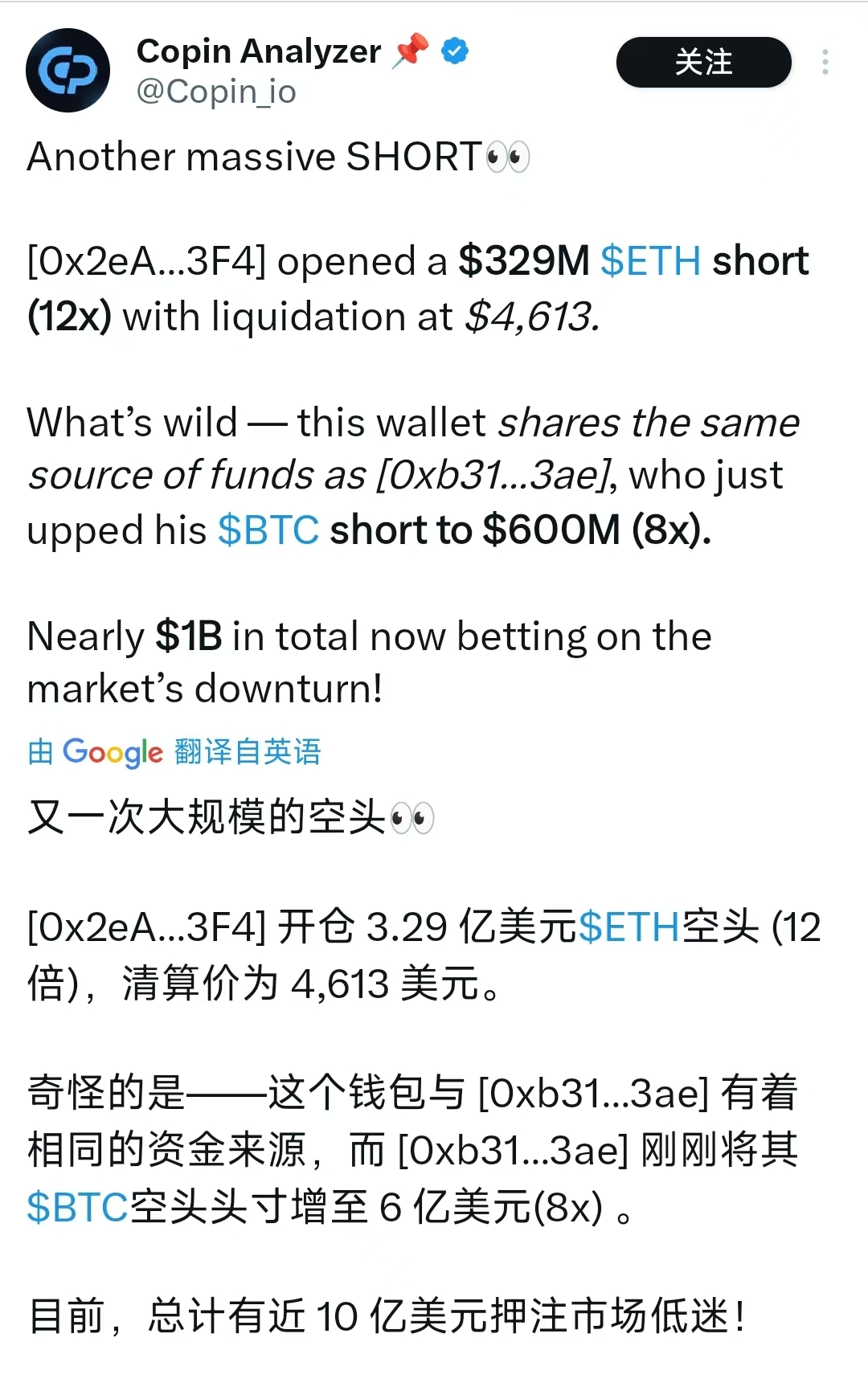 另外,有神秘账户开了近10亿美元的大饼和二饼的空单。