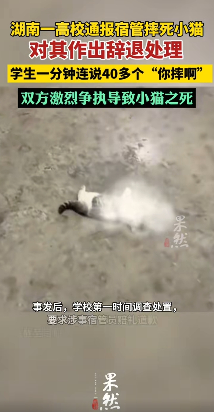 12月15日,湘西州吉首市。一则湘西为民中等职业技术学校的宿管(网传为“教官”)摔死小猫的视频在全网炸锅,没有深仇大恨,没有紧急险情,只因为学生擅自把小猫带进宿舍。被宿管发现后,双方发生了争执,最终却让无辜的小猫付出了生命的代价。