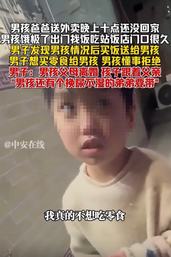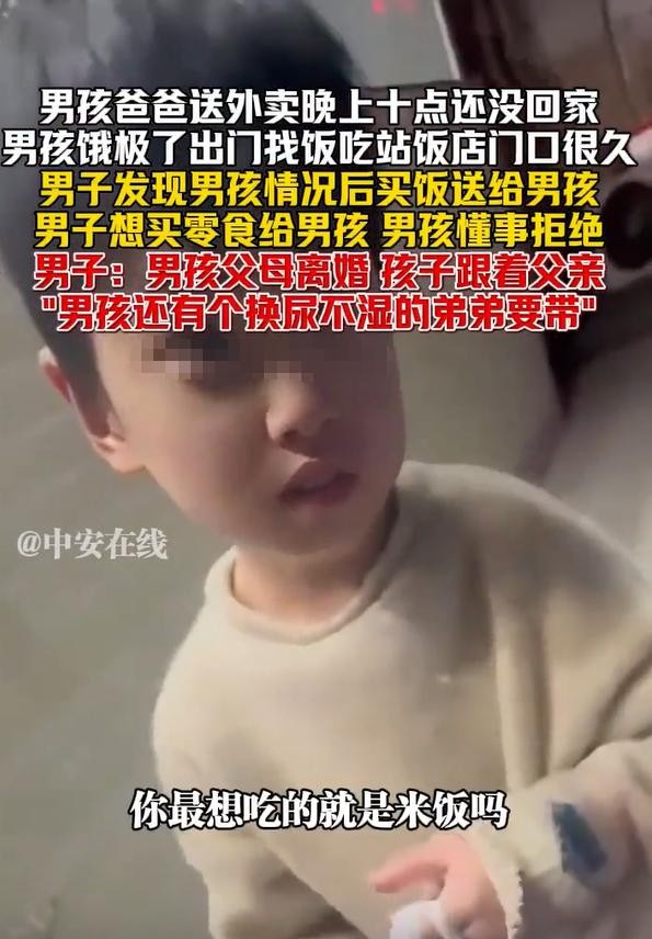 小男孩一个人跑出来找吃的,他想只想吃饭,问他吃不吃零食,小男孩也拒绝真让人心疼,视频是他被好心人拍下来的,这么乖顺的孩子,路人也是第一次见。