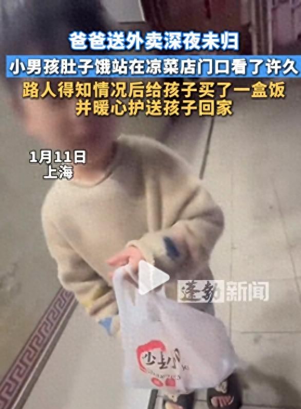 上海的1月11日晚,街上非常冷,一个孤零零小小的身影出现了,大概五六岁的样子,他四处张望,好像在找什么东西,路上的人看到他有点饿的样子,询问才得知是因为爸爸还没回家。
