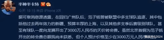 或许很多球迷记得北京过去2个赛季都试图用范子铭去更换周琦,或者赵睿,但当时有北京媒体报道,范子铭个人意愿非常重要,按照顶薪的D类合同,也不可能说随便的裁掉,更何况,范子铭当初引进的时间段,有媒体报道花费超过3千万。
