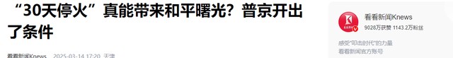 3月11日,美乌在沙特达成协议,美国提出的“停火30天”协议,乌代表团也同意这一个说法,这也是将球抛给了俄罗斯方面,都好像是,如果俄罗斯不同意,那么就是不愿意停火的罪魁祸首。