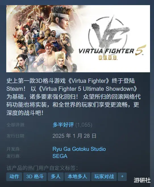 前不久,系列的最新作《VR战士5 R.E.V.O.》登录了Steam平台,说是最新,其实也是十几年前的原作修修补补而来。这是该系列自1997 年《VR战士 2》推出 PC 版之后,时隔再近30年再次登录 PC 平台,同时也引入了现代格斗游戏中非常重要的回滚网络代码等功能,联机体验能加分不少。