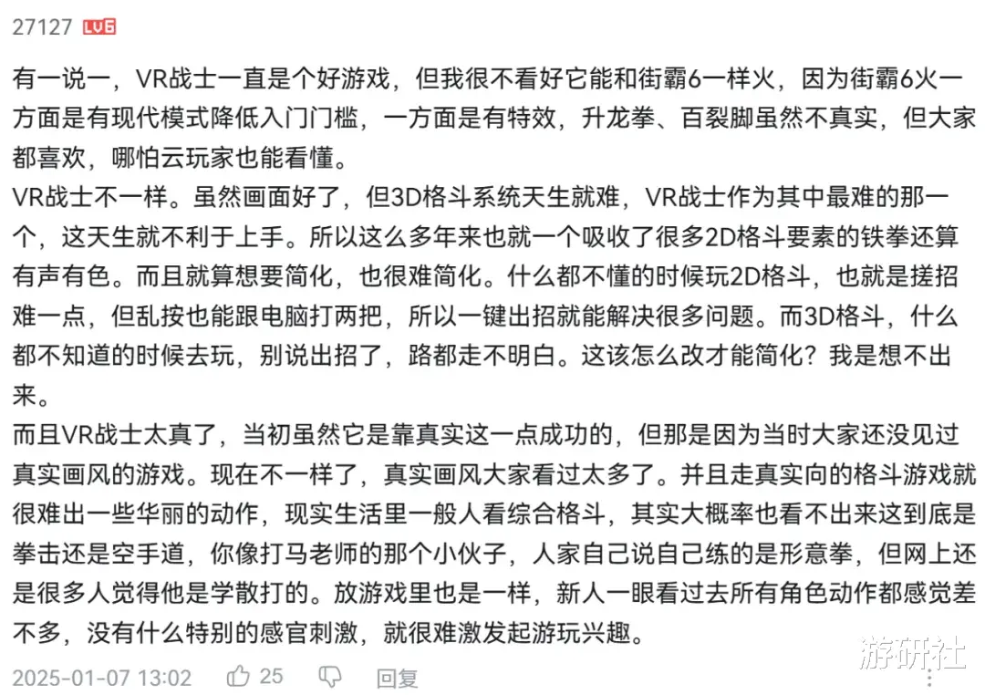 《VR战士》系列在游戏界的名声比较大,提起来都是“开创并奠定了3D格斗游戏的里程碑”“最真实的格斗游戏”“系统深度极高”“3D格斗的丰碑”“格斗鄙视链的顶端”“黄仁勋的救星”……诸如此类。但玩过这个系列的现代玩家并不多,即便慕名买了游戏,通常也很快被其摸不着头脑的手感和系统所劝退,因此空留一个“门槛高”的大众印象,在普及流行方面任重而道远。