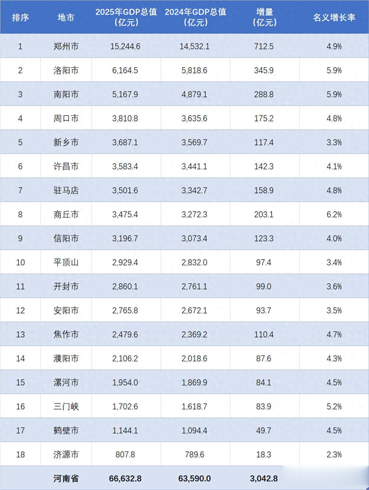 河南省是我国的人口大省,虽然经济发达程度不及沿海省市,但经济总量实为全国前列。2025年度,河南全市GDP总值共计66632.79亿元,较上年同期增加3042.8亿元,名义增长率为4.8%,增长势头稳健,总量仍居全国前六之列。