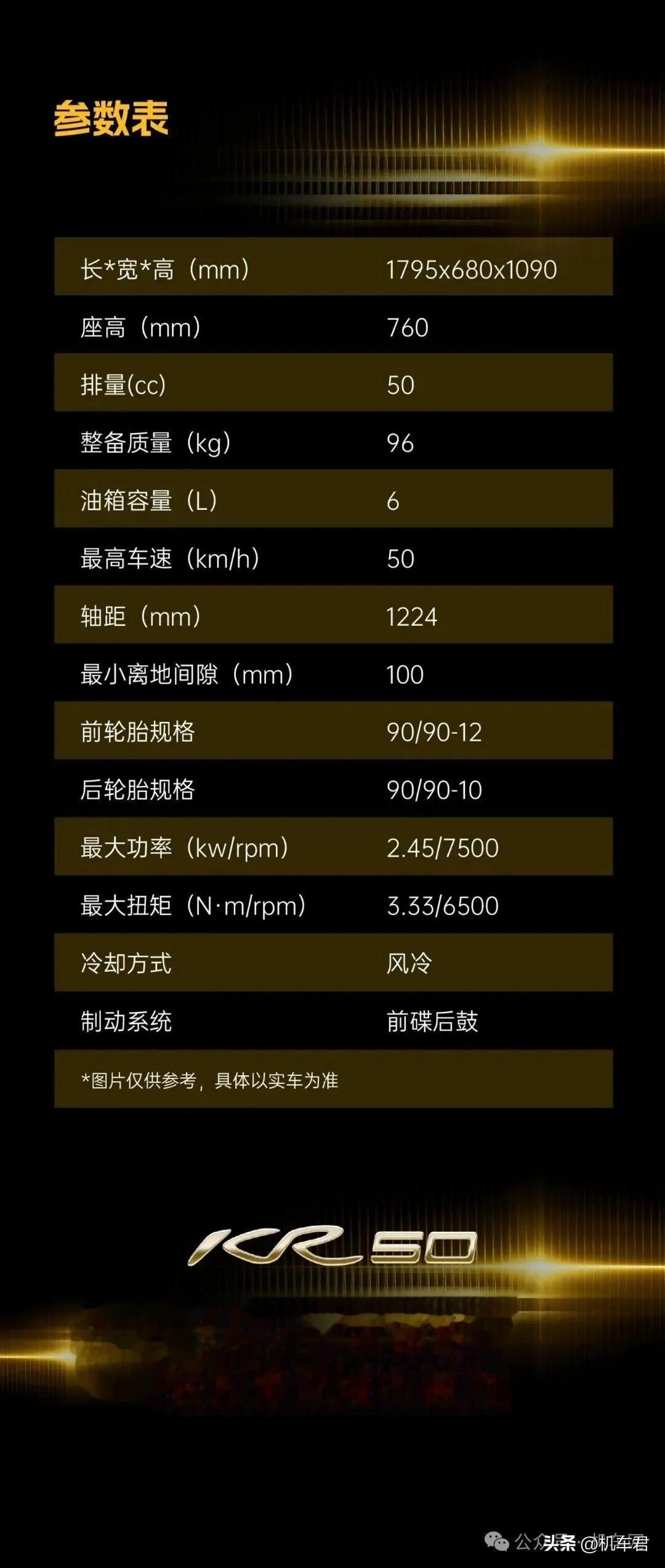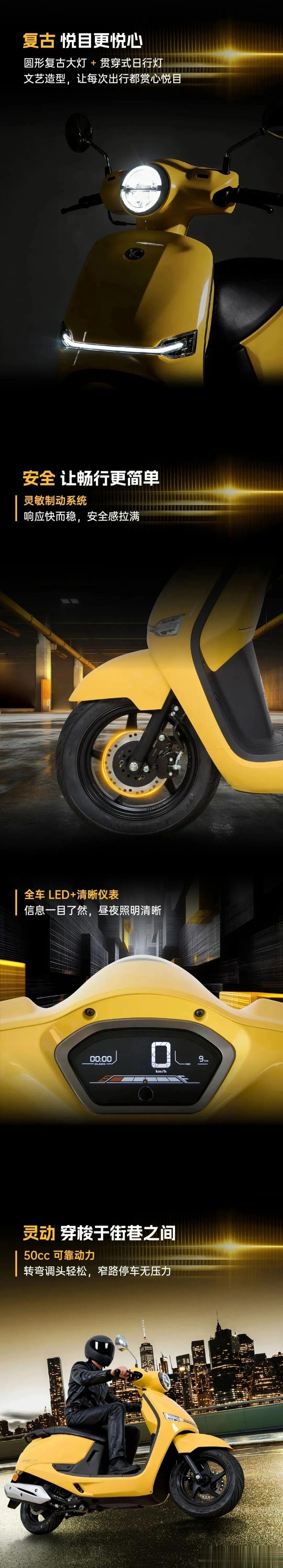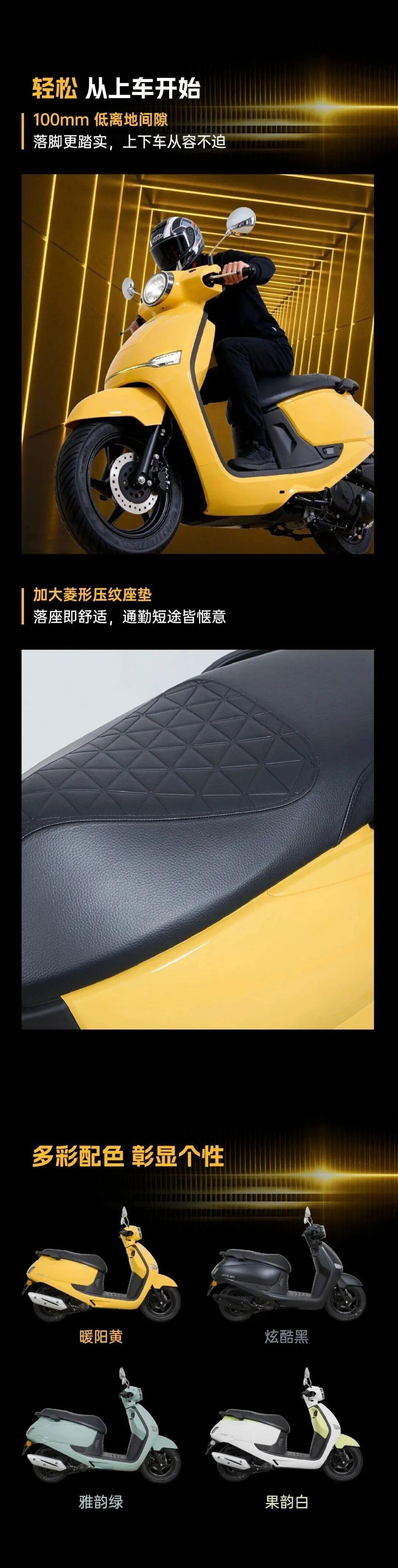 50cc风冷发动机,最大马力3.3匹,最大扭矩3.33牛米,极速50km/h,动力水平与我们的老演员新本自由Today50相当。