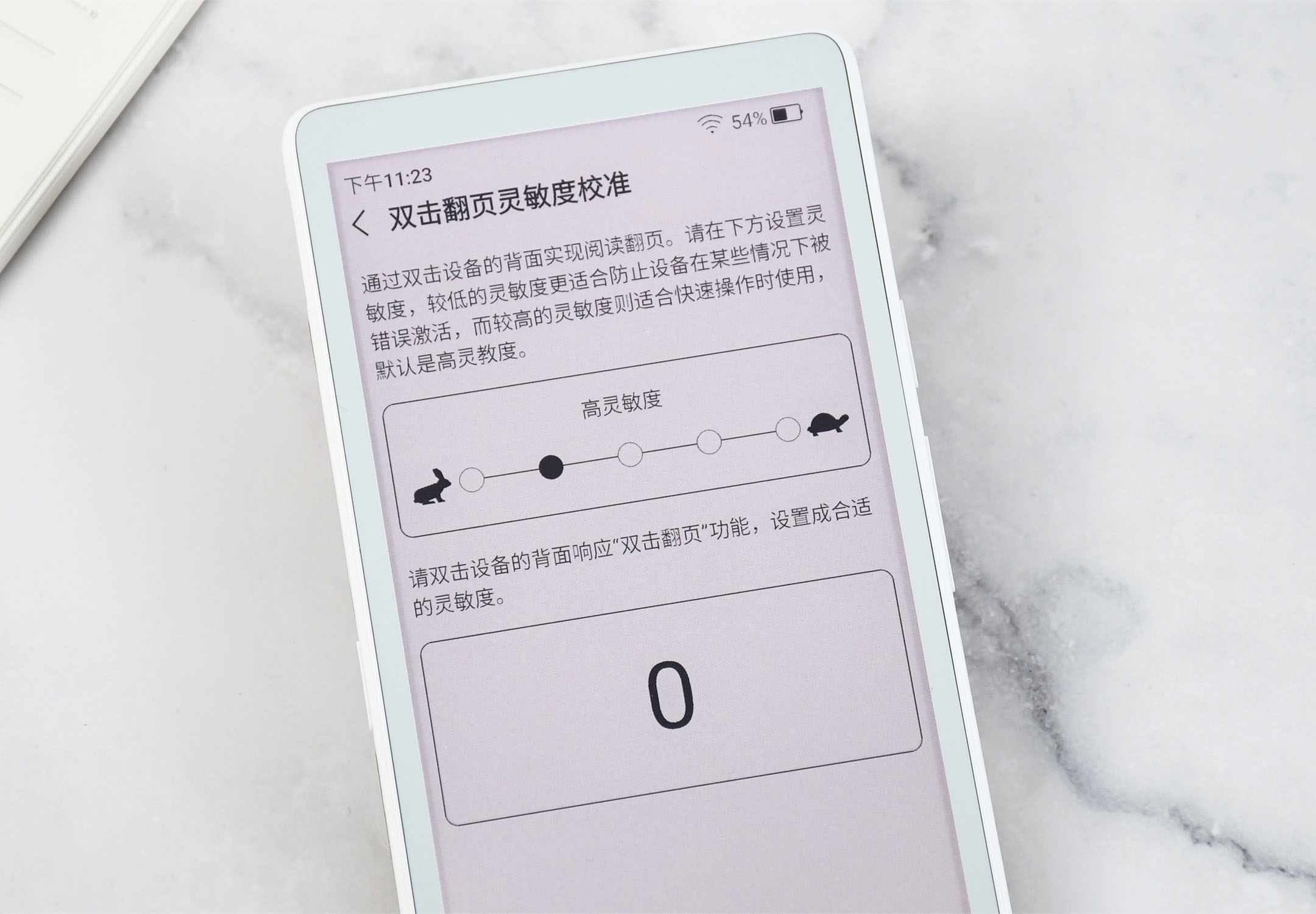 这台彩墨屏电纸书还有一个亮点就是“双击翻页”,在系统中开启对应功能后,在看书状态下,只需要连续轻触机身两次就可以实现翻页,而这也是较于以往迷你阅采用的一个新设计。
