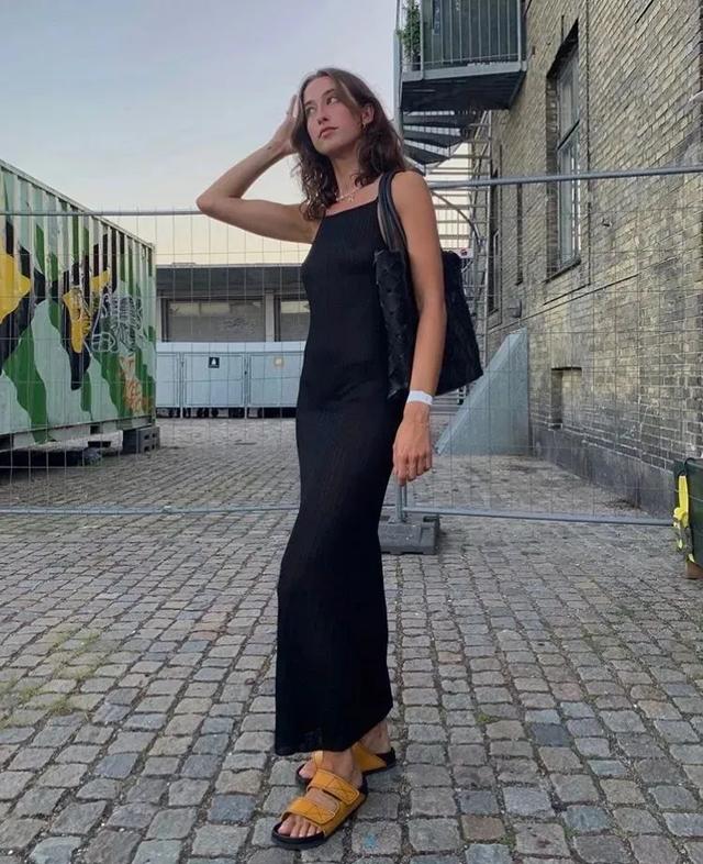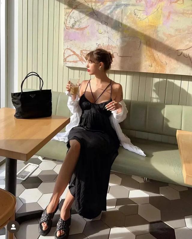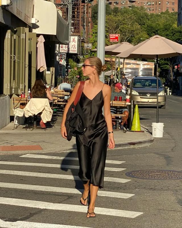 黑色缎面吊带裙轻裹身形,搭配一双黑色拖鞋,戴上墨镜,无论是街头漫步还是赴约,都显得飒爽有型。