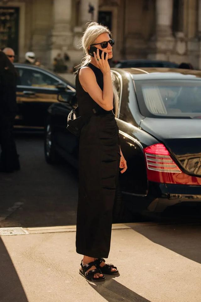 老爹凉鞋自在随性,与精致小黑裙相遇,如夜幕与影子相互依存,同色系的深浅交织,将简约的张力展现得淋漓尽致,十分迷人。