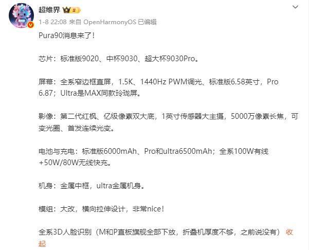 日前,数码博主“超维界”再次曝光了疑似华为Pura 90系列的更多详细配置信息。据其称,