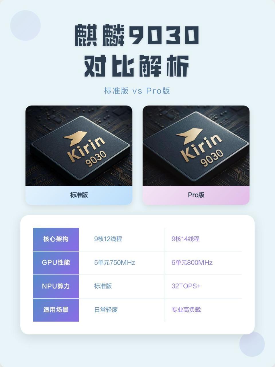 根据公开信息显示,麒麟9030系列标准版处理器和Pro版处理器在核心架构上还是略有差异的,但实际性能体验基本差不多: