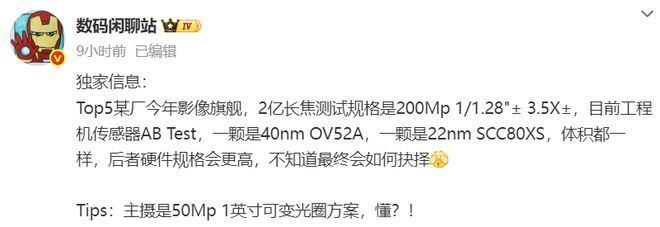另外,数码博主“数码闲聊站”也曾曝光得了疑似华为Pura 90系列迎曝光了一款新机的部分影像配置信息。据其称,“独家信息:Top5某厂今年影像旗舰,2亿长焦测试规格是200Mp 1/1.28"± 3.5X±,目前工程机传感器AB Test,一颗是40nm OV52A,一颗是22nm SCC80XS,体积都一样,后者硬件规格会更高,不知道最终会如何抉择 Tips:主摄是50Mp 1英寸可变光圈方案,懂?!”根据爆料来看,这款新机在影像方面的用料堪称十足。