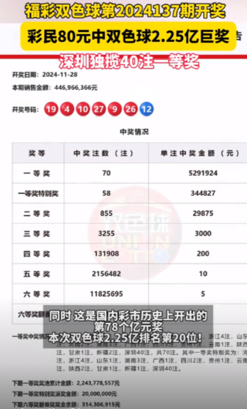 总结:2024年11月28日深圳宝安区彩民80元中2.25亿双色球巨奖的消息引发广泛关注,兑奖地点为盐田区福彩服务大厅,这背后可能是坚持或运气,无论如何都令人惊叹,也让其他彩民重燃希望。