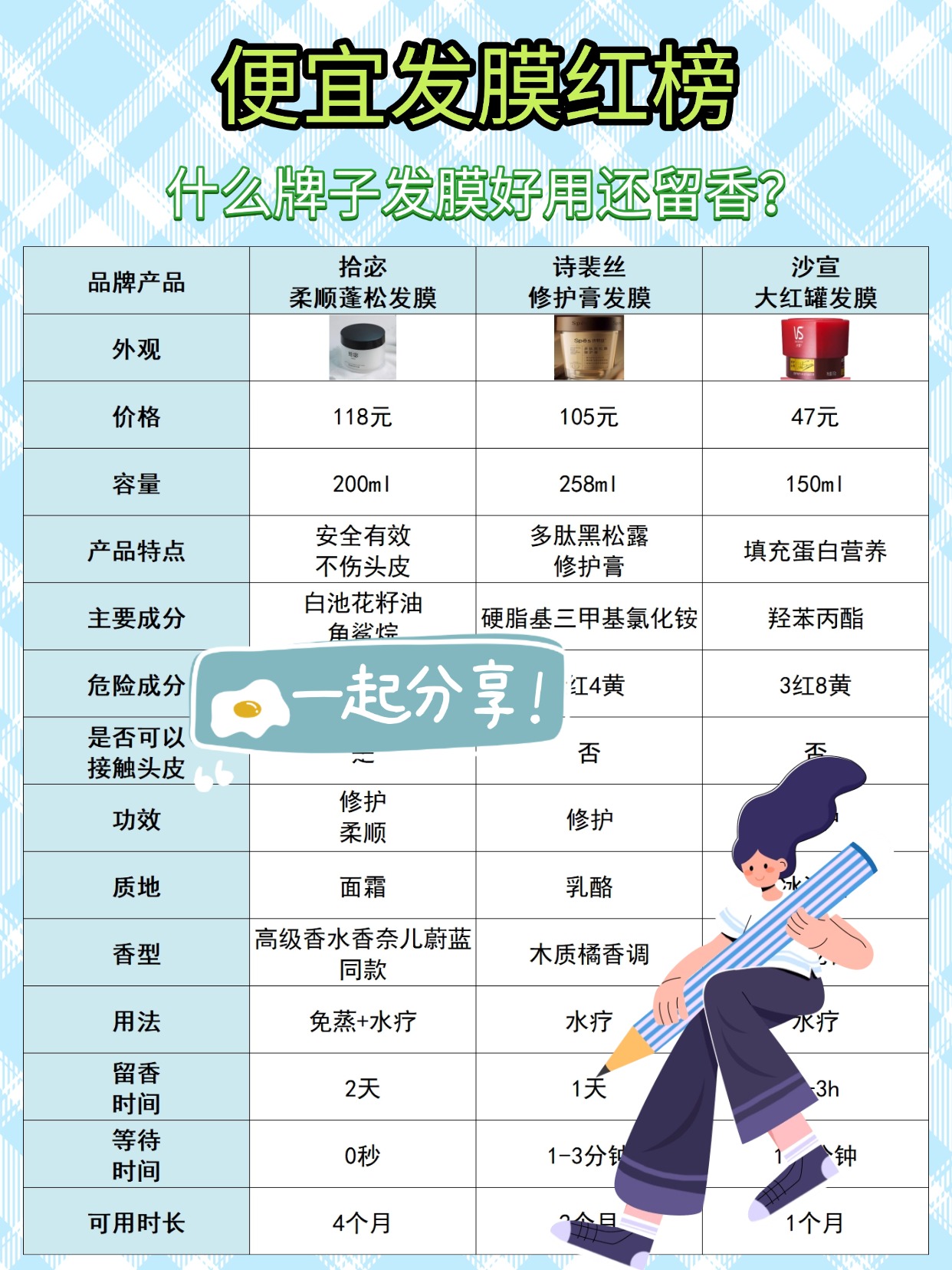 宝子们总问用什么牌子发膜比较好,还总找便宜护发素红榜,就怕走弯路,今天我就以测评博主的身份,唠点实在的,帮大家避开弯路!先解答两个核心问题:发膜好还是护发素好?发膜有必要买贵的吗?很多人分不清两者的区别,总觉得便宜护发素红榜里的款,能替代发膜,其实完全不一样,护发素是即时顺滑,只能作用于发丝表面,发膜是深层修护,能渗进发芯补营养,两者搭配用效果更好,不能互相替代。而且真的没必要买贵的,便宜发膜和护发素里,也有成分扎实的,重点看有没有水解蛋白、角鲨烷这些温和修护成分,避开硅油堆砌、大分子蛋白这类概念性添加的款,就不会踩坑。我测过不少便宜护发素和发膜,发现红榜款不一定都好用,有的只是靠营销,实际修护力很一般,很多人跟风买红榜,没分清发膜和护发素的区别,反而走了弯路。接下来分享我选购便宜发膜和护发素的经验,帮大家真正不走弯路~