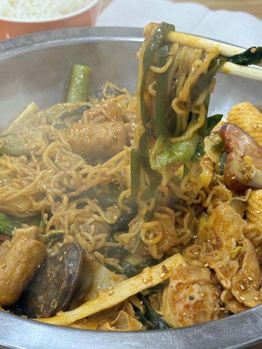 自选式川味冒菜,食材新鲜种类多。可做微辣、中辣口味,冒牛肉、冒午餐肉入味,搭配土豆粉、藕片,汤汁香浓,下饭合适。