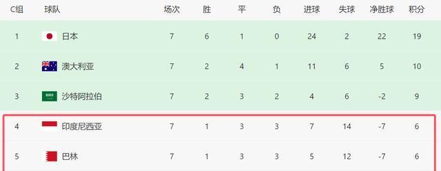 到现在为止,C组第七轮的三场比赛都已经打完了。国足在客场败北后,还是排在小组最后一名。还好巴林队和印尼队这回也没占到便宜,都在客场输了,一个是输给了日本队,一个是被澳大利亚队打败。这样一来,国足和他们之间的差距还没拉大。但是澳大利亚队这次赢了印尼队,赢得还挺多,国足现在就比排在第二的澳大利亚队少了4分。过几天,国足要在主场和澳大利亚队再较量一次,要是这回再输了,国足就彻底没希望进前两名了,也就意味着直接失去晋级世界杯的机会。
