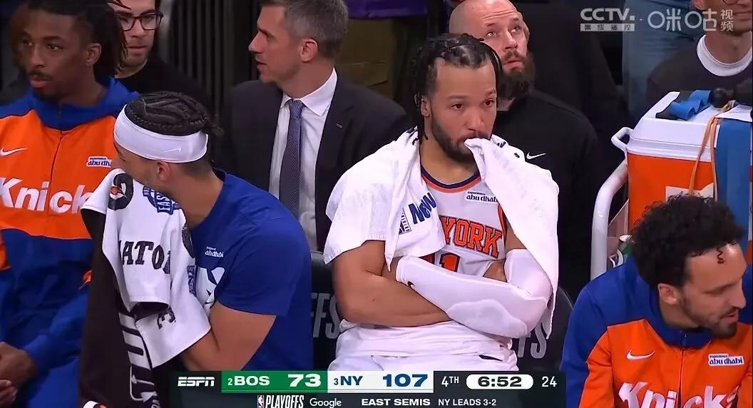 当麦迪逊广场花园的记分牌定格在119-81时,塔图姆瘫坐在替补席用毛巾捂住脸——这位上赛季FMVP的指尖还残留着未愈的骨裂刺痛,但更深的伤口来自尼克斯用钢铁洪流碾过的绿军王朝。此夜,纽约人用NBA季后赛历史上第4大的分差血洗卫冕冠军,将凯尔特人钉上“后三巨头时代最惨烈败局”的耻辱柱。