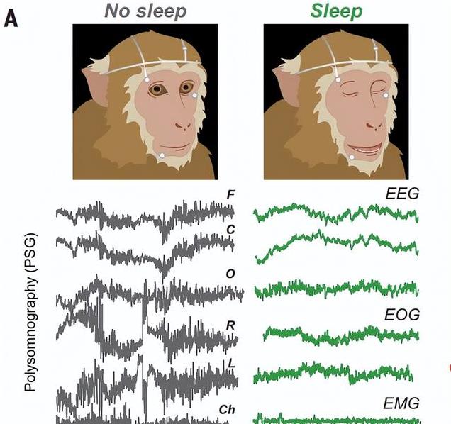 监测手段上采样用多导睡眠图(PSG)监测睡眠特征(脑电图 EEG、眼动图 EOG、肌电图 EMG)确保猕猴达到非快速眼动睡眠(NREM)1 和 2 期,还通过深度神经网络分析猕猴面部视频(闭眼、下颌放松等特征)区分 “睡眠” 和 “清醒” 状态。