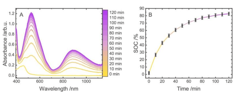 该系统的一个关键特性在于其可逆性。通过调节酸碱值(pH),反应体系可被重置并多次使用。乌尔姆大学的马尔科·哈特科恩和耶拿大学的罗宾·坎佩斯博士解释说:“要重置系统,只需改变系统的pH值即可。”这一过程还伴随颜色变化:放电时材料由紫色转为黄色,充电后恢复紫色。