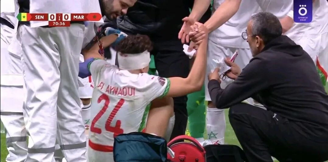 这次碰撞让两人都吃了苦头,摩洛哥球员更是不得不接受头部包扎处理,鲜血的痕迹清晰可见。
