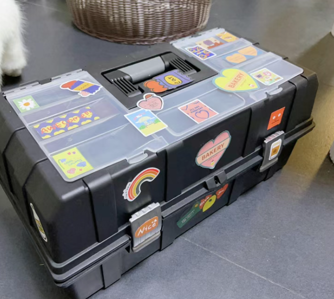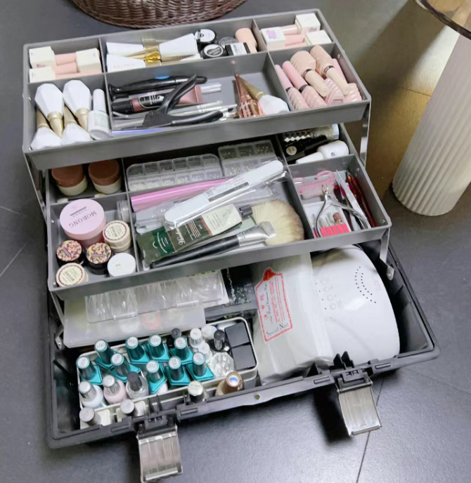 打开是3层折叠结构的,边上还带有金属卡扣,装太多东西都不会有承重的问题,像美甲工具,化妆品,瓶瓶罐罐的都能放在里面收纳。