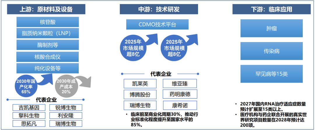 国内生态特点:中国RNA产业呈现出 “应用驱动、快速跟进” 的鲜明特征。在环状RNA等少数前沿原创平台上有领先布局,但整体上,大多数企业选择在已验证的技术路径和靶点上进行快速开发与产业化,并在肝癌、胃癌等中国高发疾病领域寻求差异化突破。产业链上下游(如CDMO公司药明生物、凯莱英)的成熟,为这一快速发展提供了关键支撑。