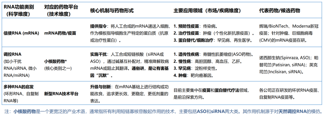 (1)两大技术分类:信使RNA(mRNA)疗法与寡核苷酸药物(以siRNA/ASO为核心)