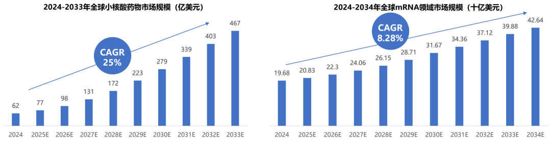 RNA药物市场增长迅猛:全球小核酸药物与mRNA疗法市场预计持续高速增长,至2033年分别有望为467亿美元(CAGR 25%)与426.4亿美元(CAGR 8.28%)。RNA药物已从传染病疫苗拓展至肿瘤、罕见病、慢性病等多个治疗领域。