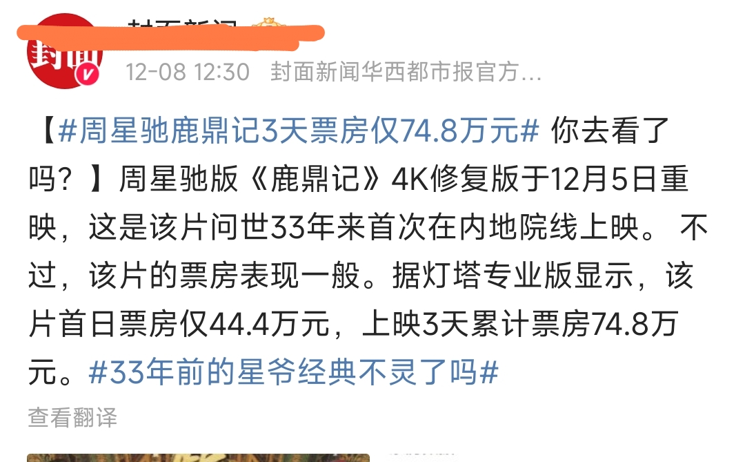 12月8日,截至发文,周星驰版《鹿鼎记》4K修复版重映后,票房只有74万,并且还包含首映第一天的44万票房。