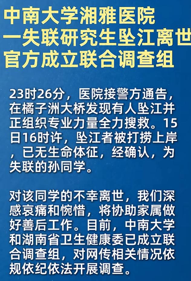 目前,坠江原因还在调查中,中南大学和湖南卫健委成立联合调查组,对网传情况正在进行调查。
