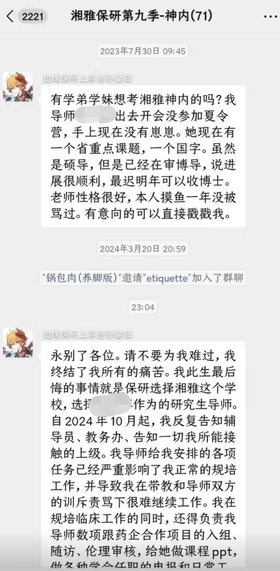 根据网传聊天记录显示,这应该是一个学生间自发组织的考研群,在2023年时,孙同学在群里询问过有没有学弟学妹想考湘雅神内,表示自己导师性格很好,哪怕自己摸鱼也没有被骂过,有意向的学弟学妹可以找他咨询。