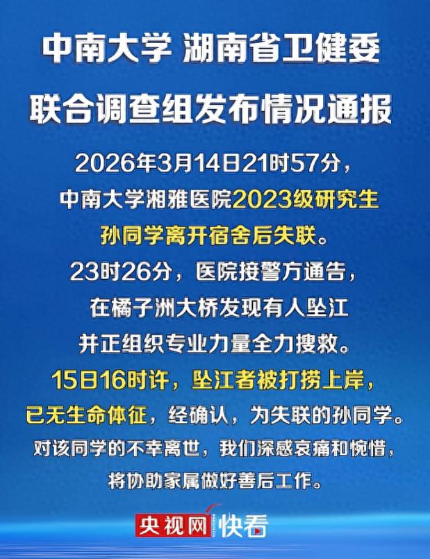 官方通报根据官方通报显示,事情发生在3月14晚上9点,中南大学湘雅医院的2023级研究生孙同学离开宿舍后失联,当晚11点26分,医院接到警方通告,在橘子洲大桥发现有人坠江,在15日下午四点,坠江者被营救上岸,正是离开宿舍后失联的孙同学,可已经没有了生命体征,目前医院整协助家属做好善后工作。
