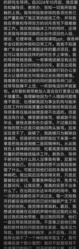在另一份网传信息中,疑似孙同学详细说明了自己在学校和医院中的繁重工作,不仅要负责帮导师跟药企对接,帮导师审核项目等,任务进展如果缓慢还会遭到导师的电话轰炸,搞得孙同学听到电话铃声就害怕。